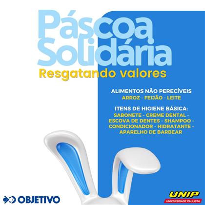 O Colégio Objetivo convida toda a comunidade escolar a participar da nossa tradicional Páscoa Solidária. Com ínicio no dia 1 de março até o dia 10 de abril, estaremos arrecadando doações de alimentos não perecíveis e itens de higiene báscio para o Abrigo ao Idoso Sol Nascente e o Lar dos Velhinhos Dona Maria Abadia de Freitas Lima, que tanto precisam do nosso apoio.