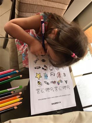A aluna Maria Otávia está realizando as atividades propostas pela Tia Silvia no Infantil 2.