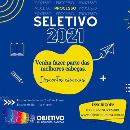 O Colégio Objetivo de Iturama, localizado na Rua Prefeito Juca Pádua, n.531 – Iturama – MG, torna pública a abertura das inscrições e estabelece as normas para realização da avaliação diagnóstica para obtenção de Bolsas de Estudos 2021, de acordo com as condições contidas neste regulamento.