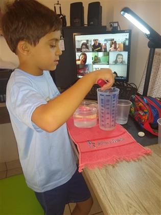 O aluno Guilherme Tomaz do 1° ano, com as orientações da professora Leni, mede e compara as diferentes medidas.