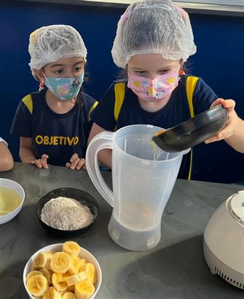 Oba! Uma aula de português diferente e gostosa na Cozinha Experimental do Colégio com os alunos da Educação Infantil 3.