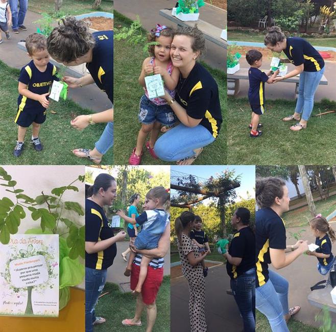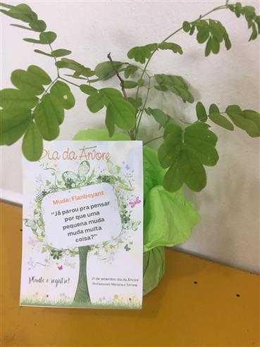 Buscando plantar em  cada criança a semente da consciência ambiental, contribuindo para o desenvolvimento de cidadãos conscientes de que um futuro melhor se constrói preservando, pois preservar é amar. Os alunos da Educação Infantil I - Fase 1 ganharam das professoras Simone e Mariana uma muda de Flanboyant em comemoração ao dia da Árvore.