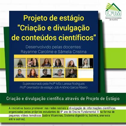O projeto de estágio "Criação e divulgação de conteúdos científicos" está sendo desenvolvido no Colégio Objetivo de Iturama-MG (@objetivoiturama_mg) pelas discentes do 8º período do curso de Ciências Biológicas - Licenciatura do Campus: Rayanne Caroline (@rayannecarol1ne) e Sâmela Cristina (@samelacryst).