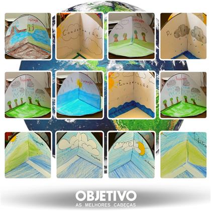 Para representar o ciclo da água na natureza, os alunos do 5° ano, da professora Vânia, construíram maquetes destacando as etapas das mudanças físicas da água, auxiliando na compreensão do ciclo hidrológico.
