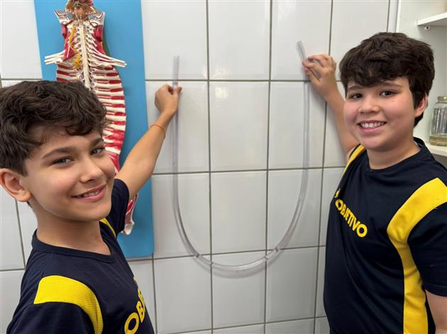 Os alunos colocaram em prática o conceito dos vasos comunicantes, observando como a água atinge o mesmo nível em diferentes pontos, mesmo com formatos variados.