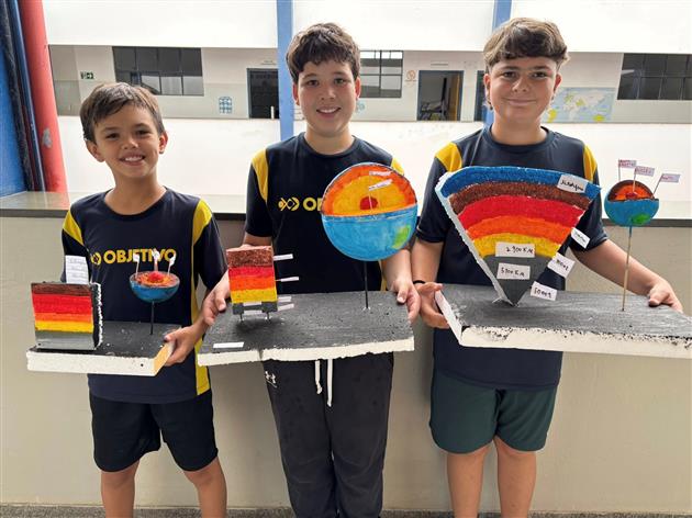 O 6º ano explorou o interior do nosso planeta de forma criativa, construindo maquetes que representam as camadas da Terra: crosta, manto, núcleo externo e interno.