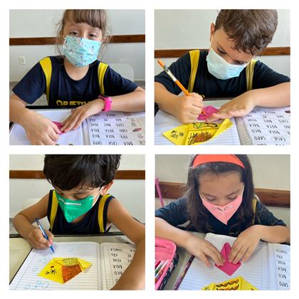 Alunos do 1° ano das professoras Cidinha e Leni realizando dobraduras e ilustrações dos personagens como os valores e virtudes são necessários para a vida.