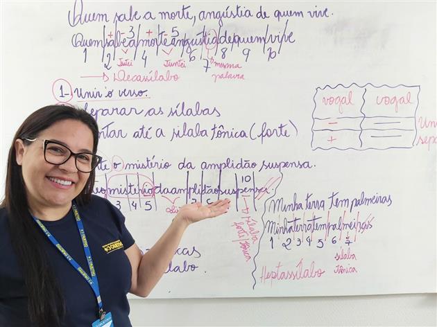 A professora de literatura Mahra Bersaneti, ministrou aula para a 1ª série sobre métrica poética.