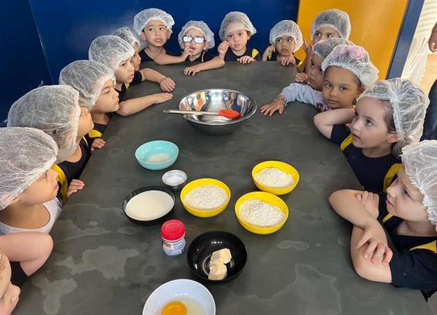 Introduzindo a contagem, a construção do conceito de número e acompanhando as transformações dos ingredientes ao preparar uma receita de pão na Cozinha Experimental do Colégio.