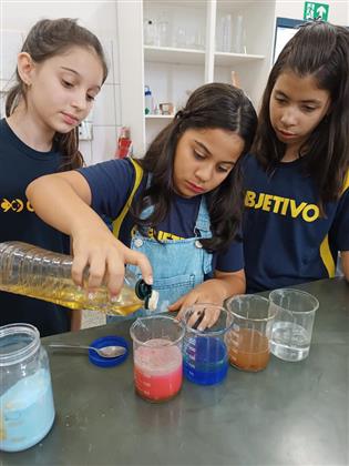 Os alunos do 6° ano realizaram prática de Ciências para identificar misturas homogêneas e heterogêneas.