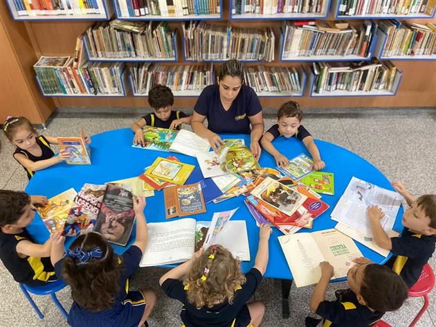 Estimulando a imaginação, o interesse pelos livros e o prazer pela leitura os alunos da Educação Infantil sempre visitam a Biblioteca do Colégio. Professoras Elaine e Tynara
