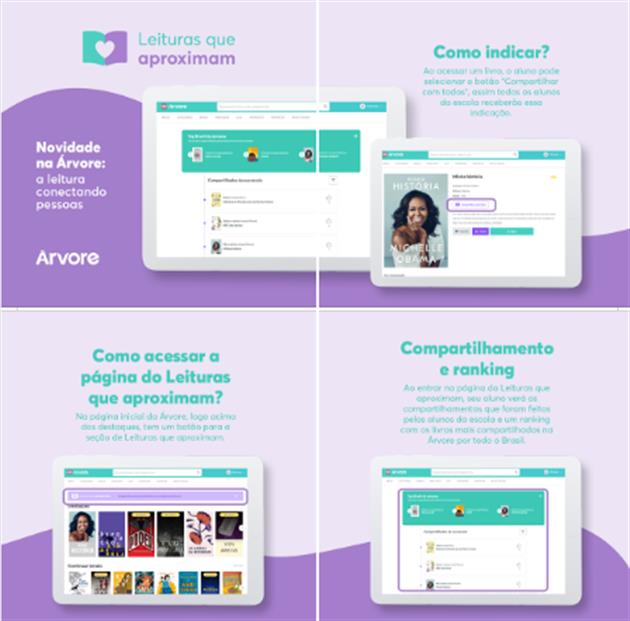 Pensando nisso, lançamos hoje na Árvore de Livros o Leituras que aproximam. Assim, ao acessarem um livro, os alunos das escolas parceiras da Árvore pode clicar no botão "Compartilhar com todos" e enviar a sugestão de título para quem estuda na mesma escola. Os livros mais compartilhados vão para um ranking nacional! Confira já na plataforma.