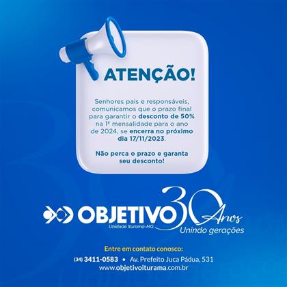 Não perca o prazo e garanta seu desconto de 50% na 1ª mensalidade para 2024 que se encerra no próximo dia 17.