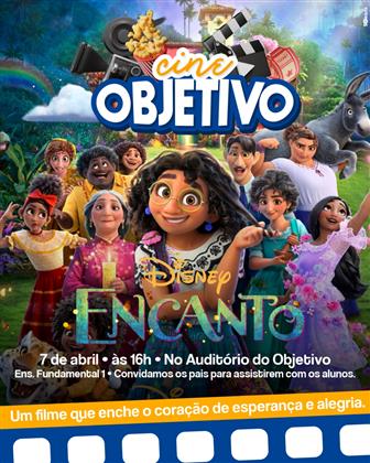 O Colégio Objetivo convida os pais dos alunos do Ensino Fundamental 1 (1° ao 5° ano) para assistirem o filme Encanto, dia 07/04 (quinta-feira) às 16 horas no Auditório do Colégio.